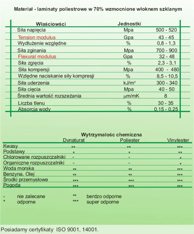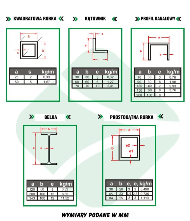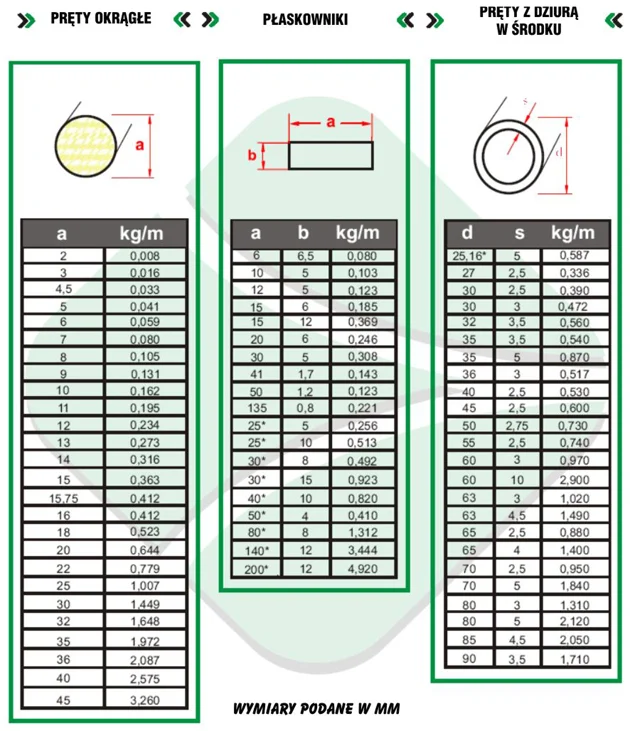 Dostępne są pręty okrągłe w wielu średnicach (od 2 do 45 mm) z podaną masą w kg/m, a także płaskowniki oraz pręty z otworem w środku – w różnych wariantach wymiarowych. W ofercie znajdują się również profile pultrudowane: rurki kwadratowe i prostokątne, kątowniki, profile kanałowe oraz belki, z wymiarami podanymi w mm i zestawieniem masy kg/m dla poszczególnych rozmiarów. W materiale (laminaty poliestrowe w 70% wzmocnione włóknem szklanym) podane są także parametry mechaniczne i odporność chemiczna, co ułatwia dobór przekroju do zastosowania.